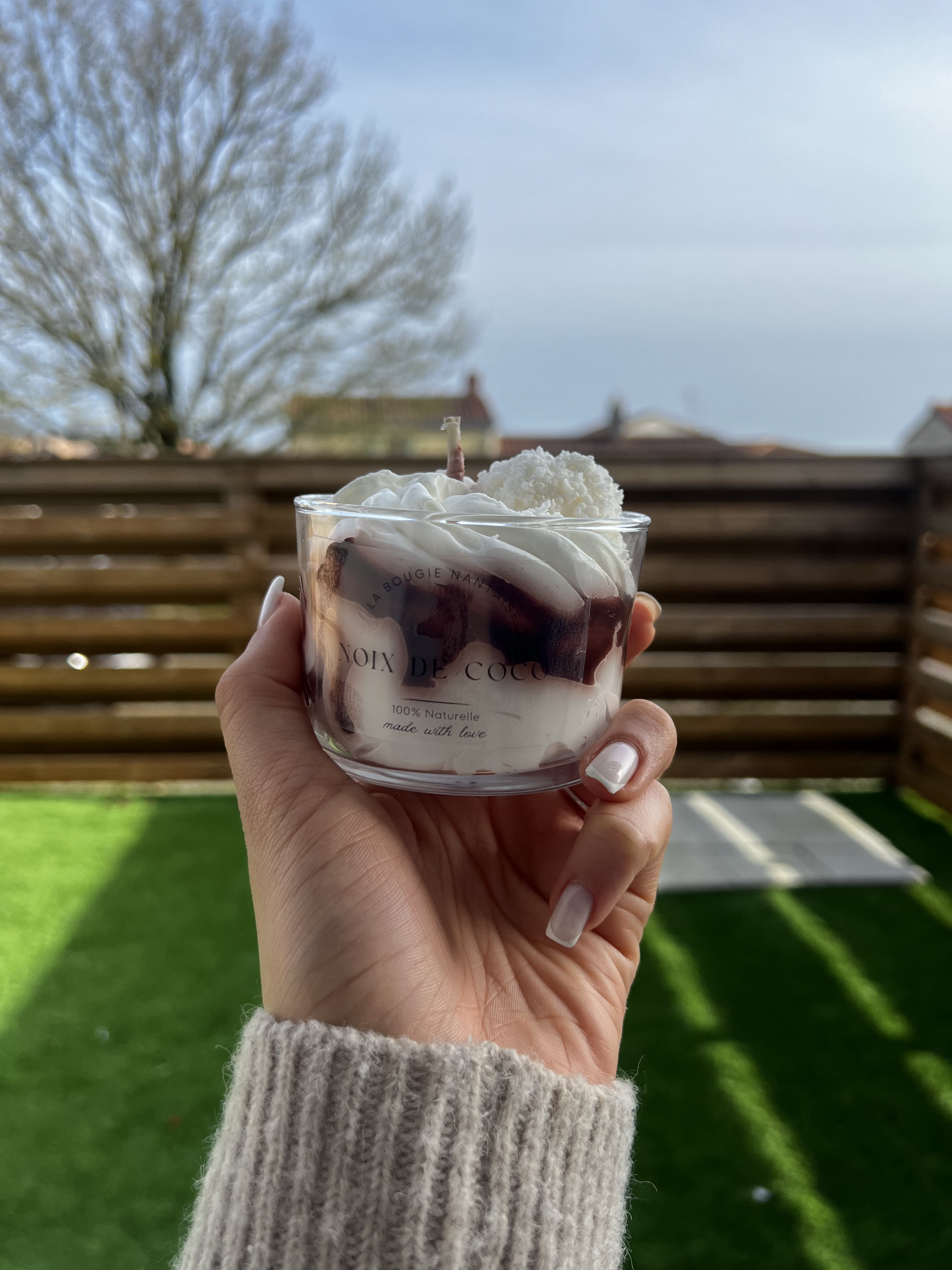 Note de Cœur : Le cœur du parfum dévoile une richesse exotique et enveloppante. La noix de coco ajoute une note tropicale, sucrée et crémeuse, transportant les sens vers des plages lointaines. Le beurre de karité, avec sa texture riche et onctueuse, ajoute une profondeur nourrissante et douce. Ensemble, ces notes centrales créent une expérience sensorielle luxueuse et apaisante.